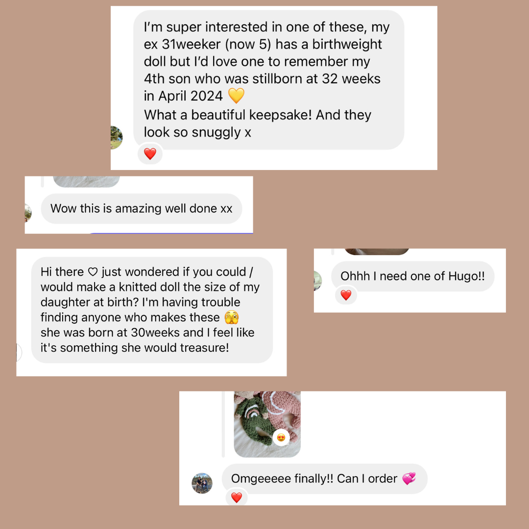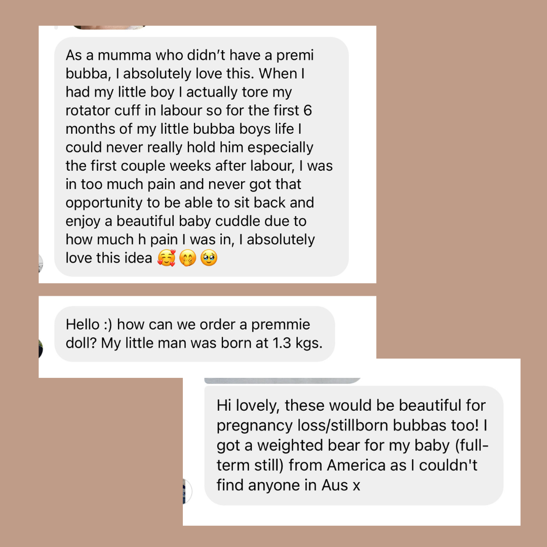 Select the closest weight to your baby’s birthweight in increments of 100g. Please note due to the handmade nature of the dolls we do our best to get the exact weight but the weight may vary by 50g -80g.