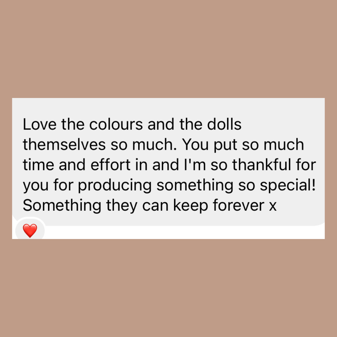 Each doll is handcrafted and ships within 3-4 weeks. Around 3-5 hours of craftmanship are put into each doll.